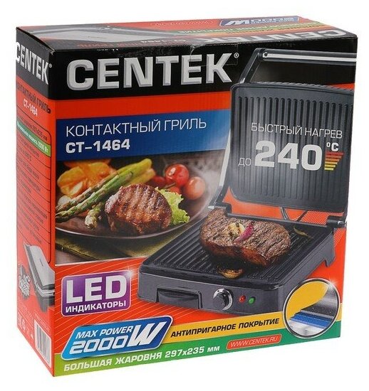 Контактный гриль Centek CT-1464, 2000 Вт, 297х235 мм, антипригар, нагрев 240 °С