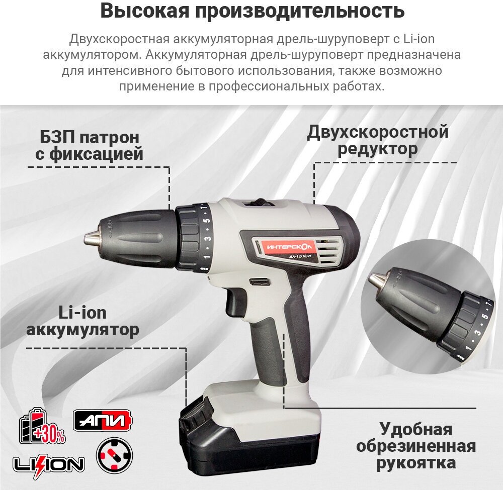 Лучшие цены. ИНТЕРСКОЛ представляет Вашему вниманию модернизированную двухскоростную аккумуляторную дрель-шуруповерт с Li-ion аккумулятором. Новые модели отличаются высокой энергоемкостью, отсутствием саморазряда и эффекта памяти. Аккумуляторные дрели-шуруповерты – один из наиболее востребованных и распространенных инструментов, их можно встретить везде, от большой стройки до дачи или квартиры. Новая серия двигателя, развивающего больший момент и обладающего повышенной экономичностью – специальная разработка. Магазины в вашем городе.