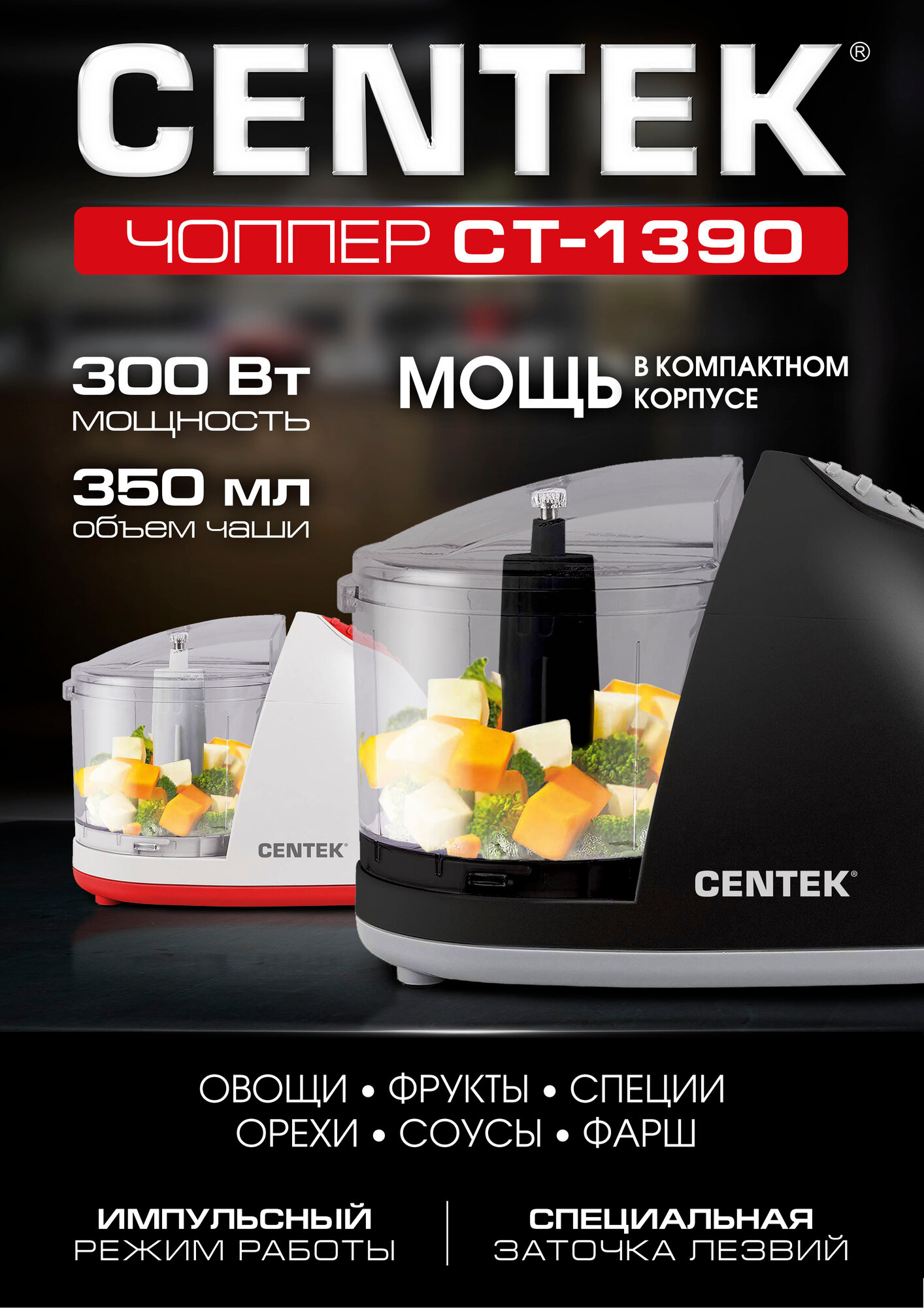 чоппер centek ct-1390 black /300вт, стакан 350мл, импульсный режим