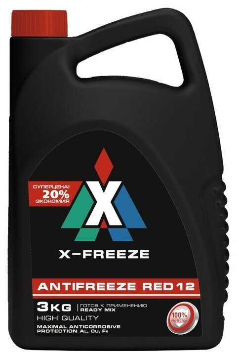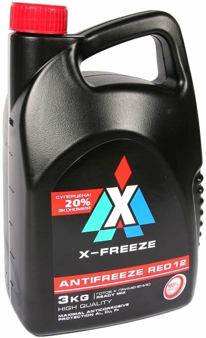 Лучшие цены. Антифриз X-FREEZE RED 12 с улучшенной антикоррозионной защитой предназначен для круглогодичного использования в легковых и грузовых автомобилях. Изготовлен из высококачественного этиленгликоля с применением уникального многофункционального антикоррозионного пакета присадок. Не содержит нитриты, амины, фосфаты. Новейшая формула обеспечивает повышенный срок эксплуатации и улучшенную циркуляцию антифриза, эффективную и долговечную защиту системы охлаждения от коррозионного воздействия и образования накипи. Магазины в вашем городе.