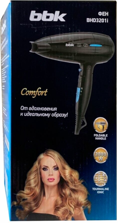 Лучшие цены. Стильная модель BHD3201i серии Comfort незаменимая вещь для тех, кто часто путешествует. Фен имеет небольшой вес, складная ручка обеспечивает максимальное удобство хранения и транспортировки. Мощность 2000 Вт. Имеется 2 уровня температуры и скорости, а также режим холодного воздуха для фиксации прически, а турмалиновое покрытие решетки сохраняет здоровье и блеск волос. Съемная решетка воздухозаборника обеспечивает легкую чистку фена. Магазины в вашем городе.