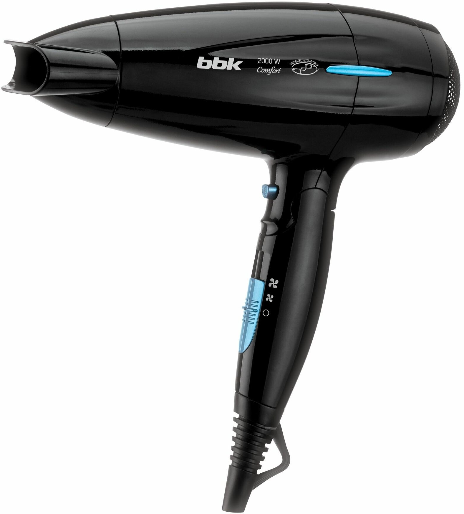 Фен для волос BBK BHD3201i черный/голубой, мощность 2000 Вт, 2 температурных режима, 2 скорости обдува, складная ручка, ионизация
