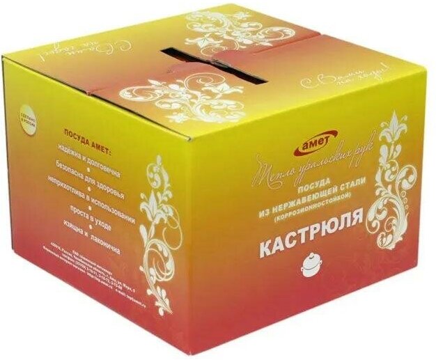 Лучшие цены. Кастрюля Амет «Славяна» 1,75 л производится из пищевой нержавеющей стали, отвечающей требованиям ГОСТ. Имеет гладкую матовую поверхность, которая легко чистится и прекрасно смотрится на кухне. Объёмные ручки обеспечивают надёжный ухват. В комплекте идёт стеклянная крышка с отверстием для сброса пара. Кастрюля из нержавейки с теплораспределительным дном отличается хорошей теплопроводностью, равномерно прогревается, не позволяет пище подгорать и долго сохраняет блюдо тёплым. Магазины в вашем городе.