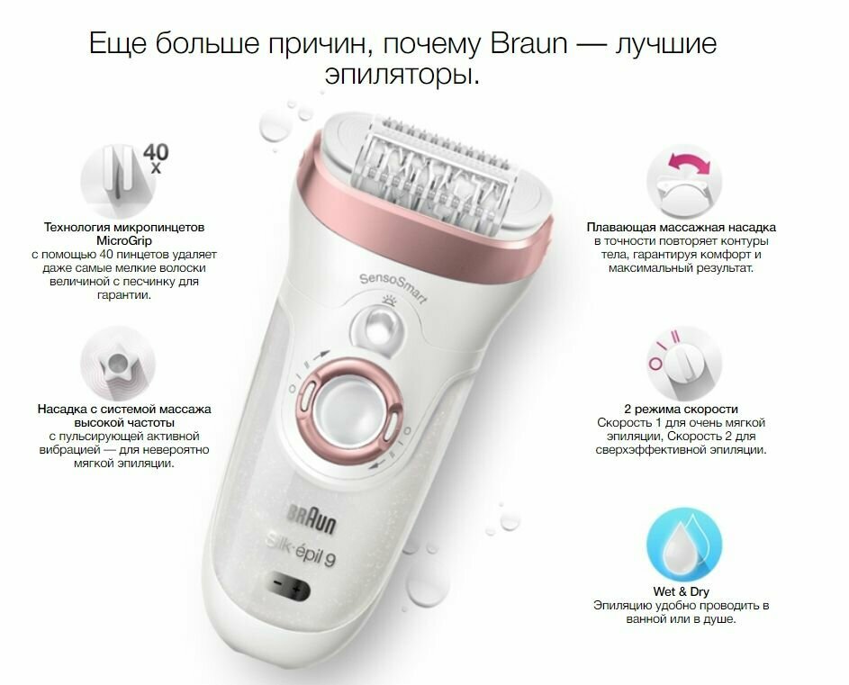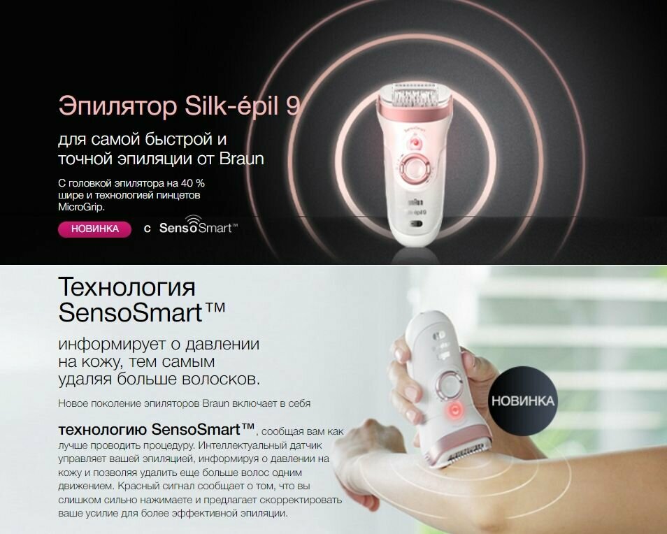 Лучшие цены. Эпилятор женский Braun Silk-epil 9 SensoSmart Extreme-Spa + бесплатный триммер для бикини Braun Silk-épil FG1100 Что такое SensoSmart: Интеллектуальный датчик направляет эпиляцию, обеспечивая необходимое давление для удаления еще большего количества волос одним движением. 1. Соответствует всем контурам тела. Поворотная головка Braun Silk-épil 9 позволяет адаптироваться к любым контурам тела. Это обеспечивает лучший контакт эпилятора с кожей и еще более мягкое воздействие. 2. Очень широкая головка. Магазины в вашем городе.