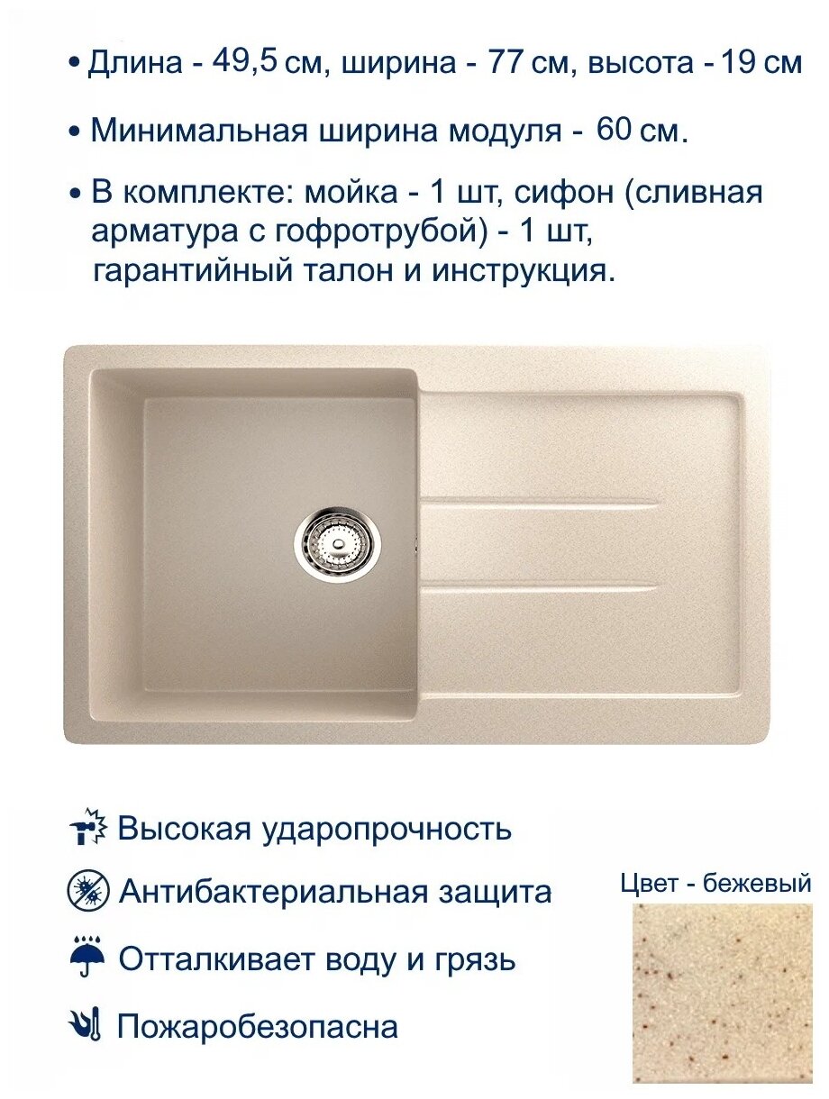 Мойка кухонная Ulgran из искусственного мрамора прямоугольная U-507, цвет: песочный, база: 74.5х47 см, арт. U-507-302 6 749 ₽ Подробнее