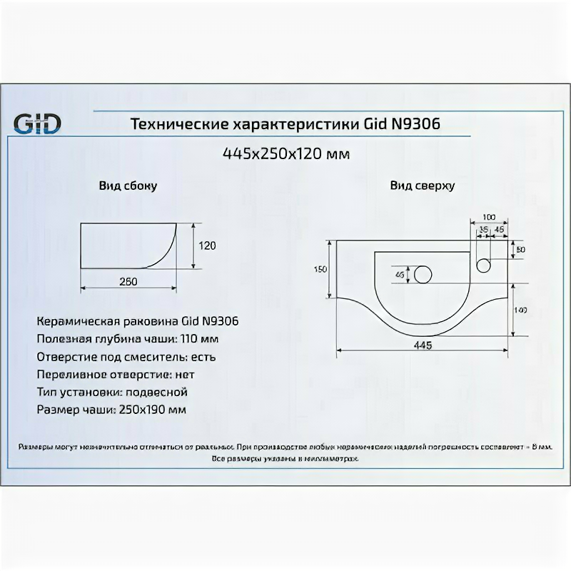Умывальник Подвесная раковина 44.5x25х12 см, Gid, N9306