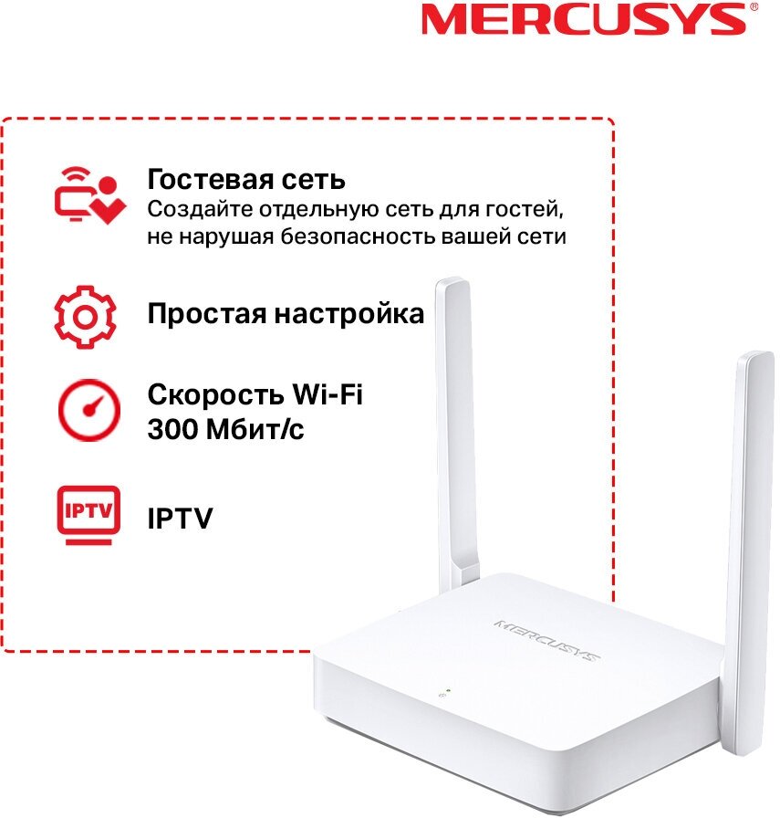 Роутер Mercusys Mw301r, 300Мбит/с, 2 порта 100 Мбит/с, 2 антенны .