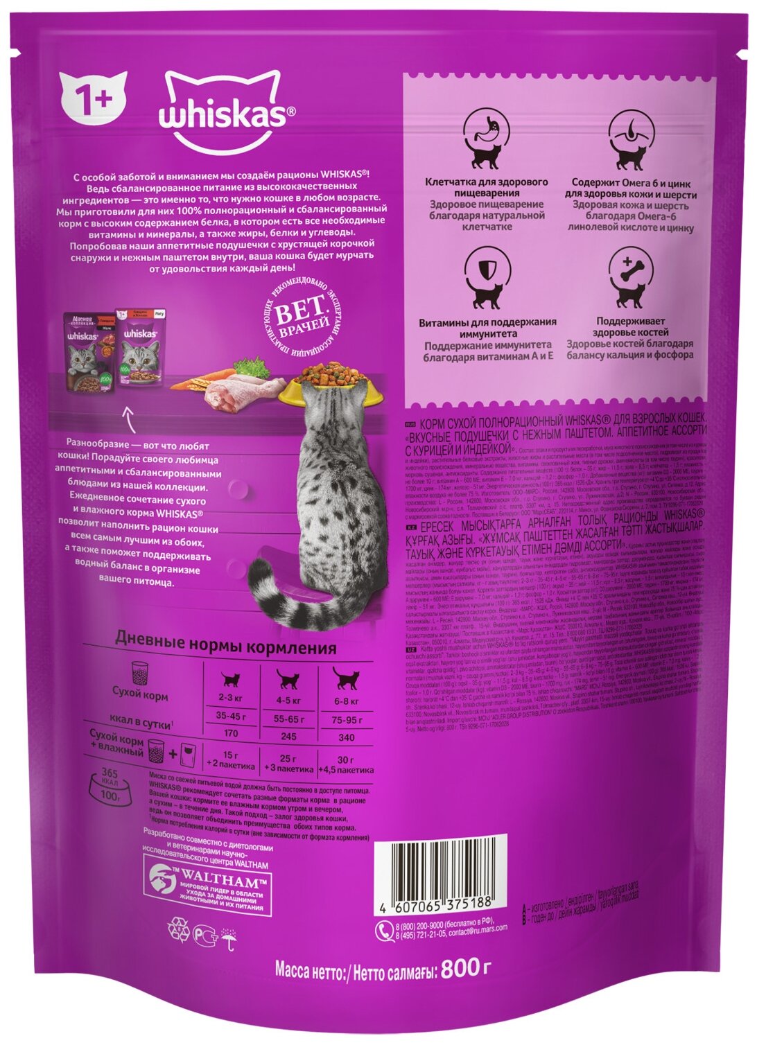 Корм сухой Whiskas полнорационный для взрослых кошек «Вкусные подушечки с нежным паштетом. Аппетитное ассорти с курицей и индейкой», 800г