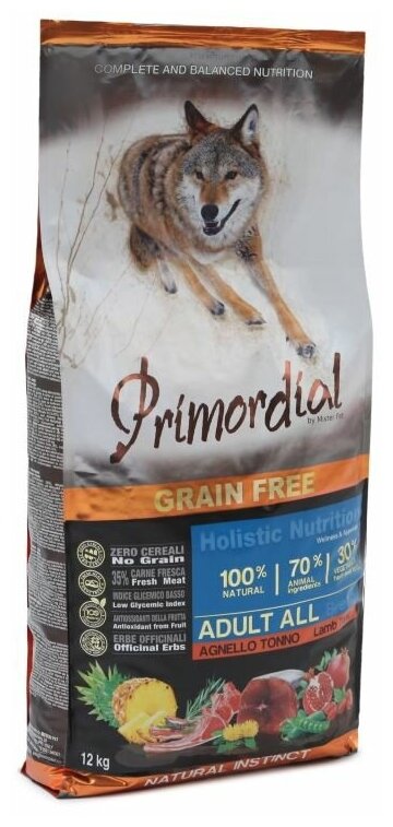 PRIMORDIAL ADULT ALL BREED беззерновой для взрослых собак всех пород с тунцом и ягненком (12 кг)