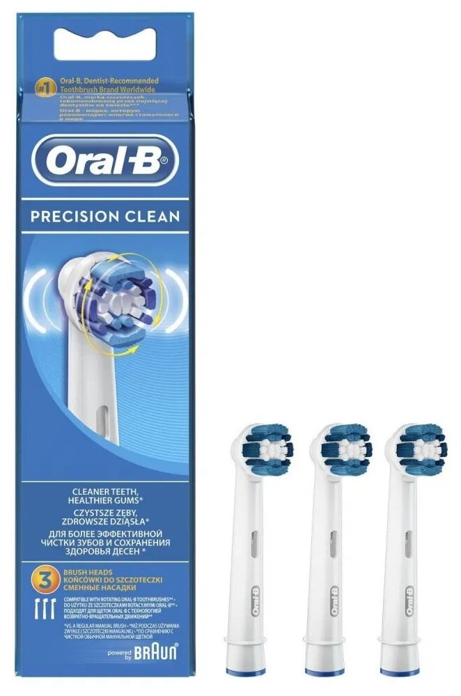 Лучшие цены. Насадка Oral-B Precision Clean разработана для эффективного базового ухода на каждый день. Она удаляет зубной налет, очищая каждый зуб со всех сторон. Предназначена для эффективной чистки. Уникальная круглая насадка, разработанная совместно со стоматологами, удаляет до 100% больше зубного налета, чем обычная зубная щетка. Щетинки очищают зуб и ткани вокруг зуба, позволяя эффективно удалять бактериальный налет. Голубые щетинки Indicator обесцвечиваются наполовину, сигнализируя о необходимости замены насадки. Магазины в вашем городе.