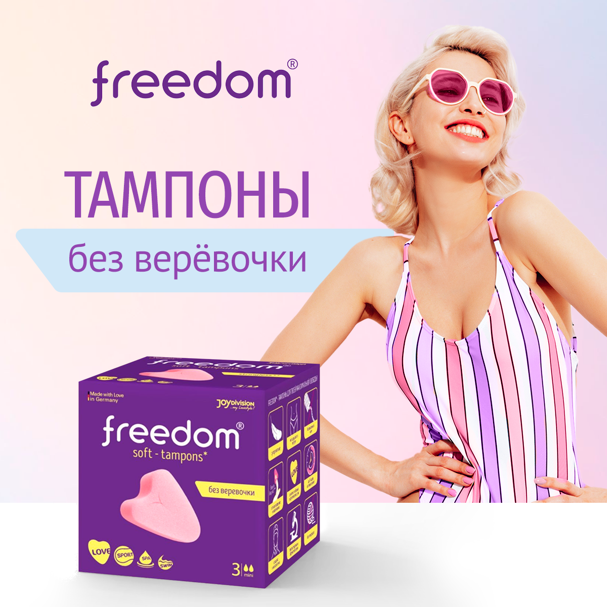 Лучшие цены. Тампоны FREEDOM без веревочки – это возможность жить полной жизнью в любой день цикла. С ними можно заниматься спортом, плавать и посещать СПА в критические дни и даже заниматься сексом во время месячных без ограничений. Секрет в супермягком материале и уникальной форме тампонов Фридом в виде сердечка. Для извлечения предусмотрена не привычная ниточка, а специальная прорезь. Благодаря этому тампоны без веревочки абсолютно незаметны под любой одеждой (и даже без нее). Магазины в вашем городе.