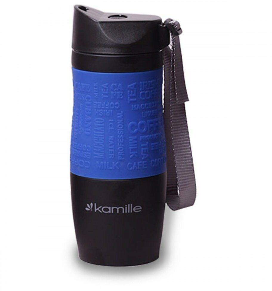Термокружка 380 мл. из нержавеющей стали Kamille KM 2052A с TPR-вставкой и ремешком (24 / синий)