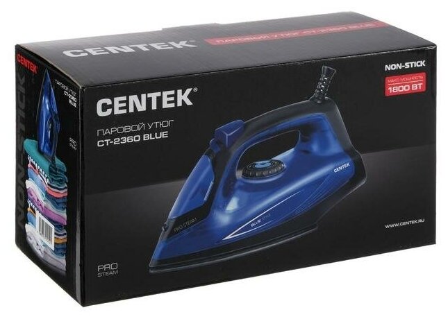 Лучшие цены. Утюг Centek CT-2360, 1800 Вт, антипригарная подошва, 200 мл, чёрно-синий -Вес: 884 г. -Фасовка: 1 шт -Тип индивидуальной упаковки: Цветная картонная коробка -Длина упаковки: 26 -Высота упаковки: 14 -Ширина упаковки: 11 -Объем упаковки: 4.004 -Объем продукта: 4.29 -Объем бокса: 42.9 -Материал: Металл, пластик -Цвет: Синий, Чёрный -Мощность, Вт: 1800 -Гарантийный срок, мес: 12 -Скорость парового удара, г/мин: 80 -Объём резервуара для воды, мл: 200 -Материал подошвы утюга: Антипригарное покрытие -Подача пара. Магазины в вашем городе.