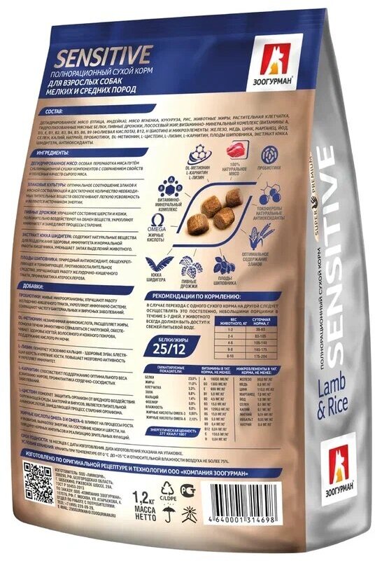 Корм сухой Зоогурман Sensitive для взрослых собак мелких и средних пород, ягненок с рисом, 1,2 кг