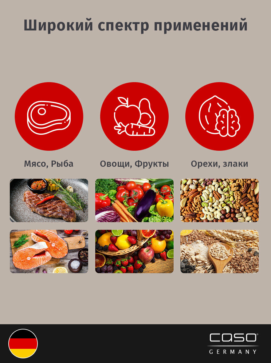 | Функции и возможности | вакуумирование контейнеров / для влагосодержащих продуктов / двойной сварочный шов / контейнер для рулона / встроенный нож для пленки / контейнер для сбора жидкости |