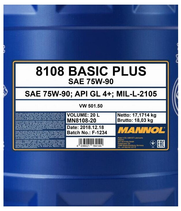 Трансмиссионные масла MANNOL MN8108-20 8108-20 MANNOL BASIC PLUS GETRIEBEOEL 75W90 20 л. Синтетическое трансмиссионное масло 75W-90