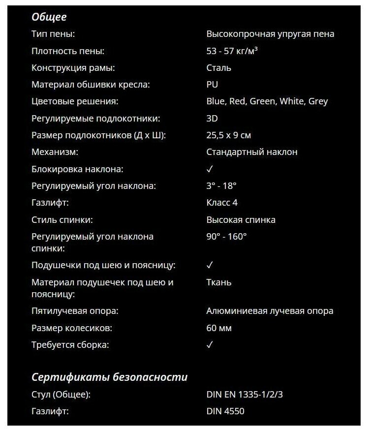 | Регулировки | наклона спинки степени жесткости качанияподдержка поясницы высоты сиденьявысоты подлокотниковподлокотников по горизонтали (160 градусов) |