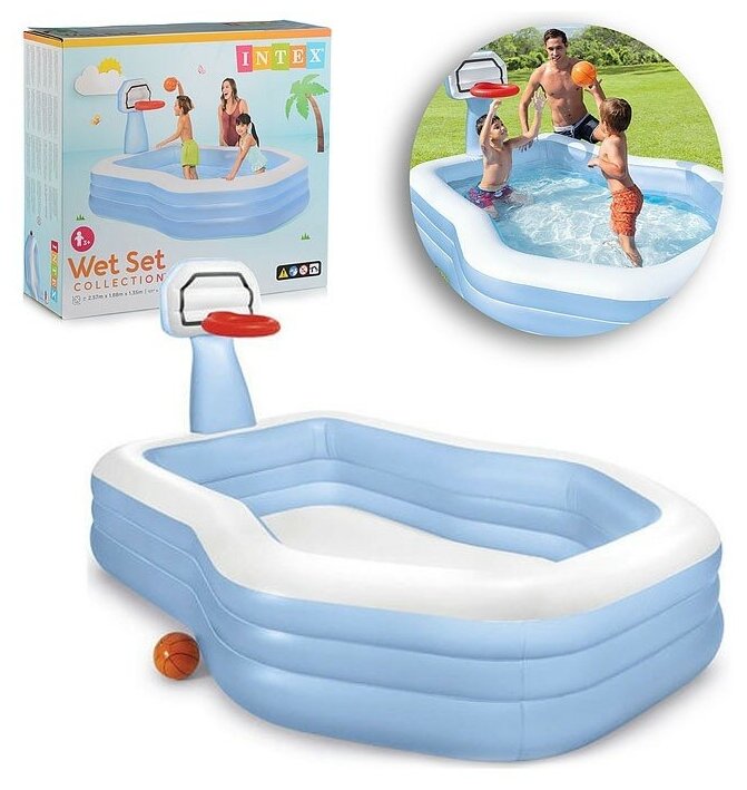 Бассейн надувной семейный с баскетбольным кольцом и надувным мячом, 257х188х135 см, 57183NP Intex
