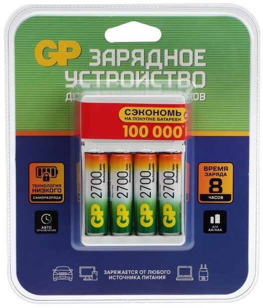Универсальное зарядное устройство с USB для аккумуляторов GP и 4 шт АКБ 2700 мАч (АА) + провод micro USB (GP 270AAHC/CPB-2CR4)