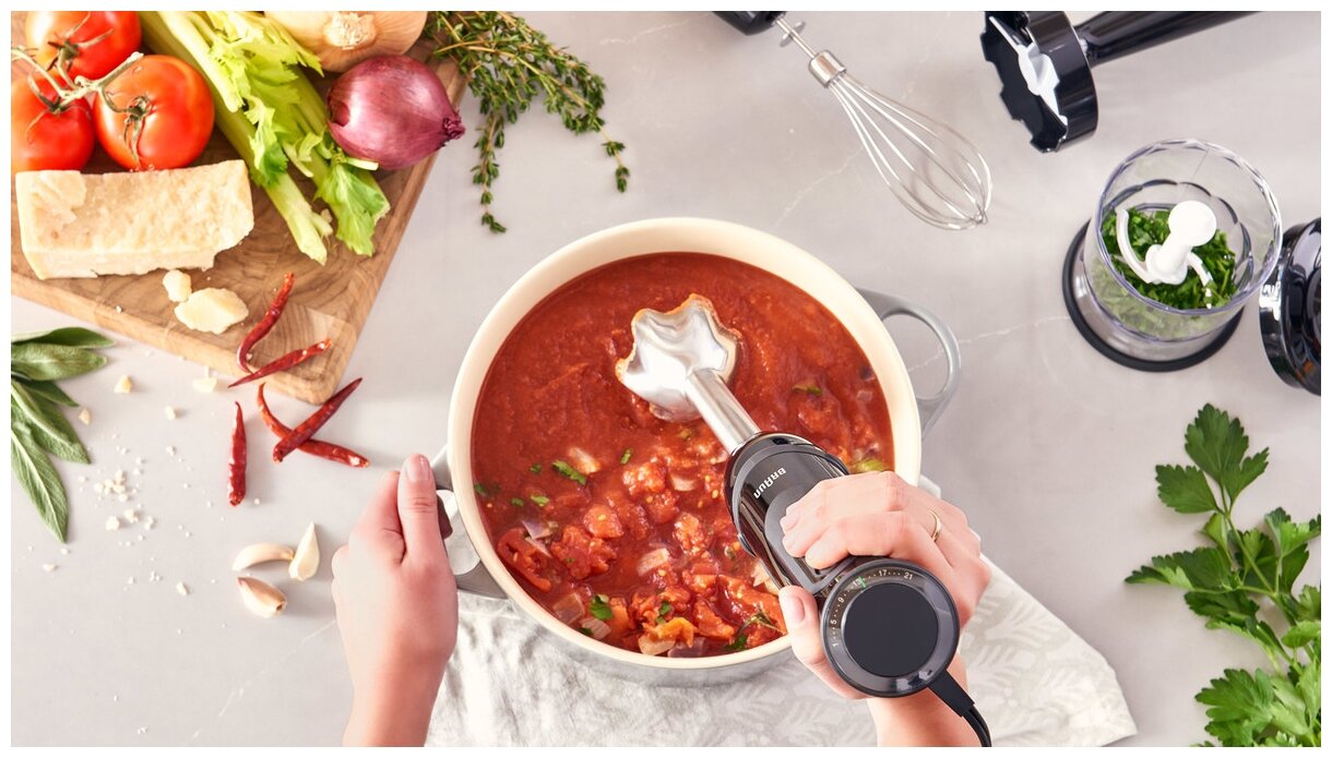 Лучшие цены. Тип блендера: погружнойМощность (Вт):1000Материал корпуса: пластикЦвет корпуса: черныйКол-во чаш для измельчения:1Объем первой чаши (л):0,5Объем второй чаши (л): нетМатериал чаши: пластикКол-во скоростей:21+ТурбоСрок гарантии (мес.):24Страна-изготовитель: РумынияКомплектацияВенчик для взбивания: естьНасадка для измельчения: естьНасадка для пюре: естьНасадка-шинковка: нетДополнительная информация: информация: используются технологии: PowerBell, SplashControl, EasyClick. Магазины в вашем городе.