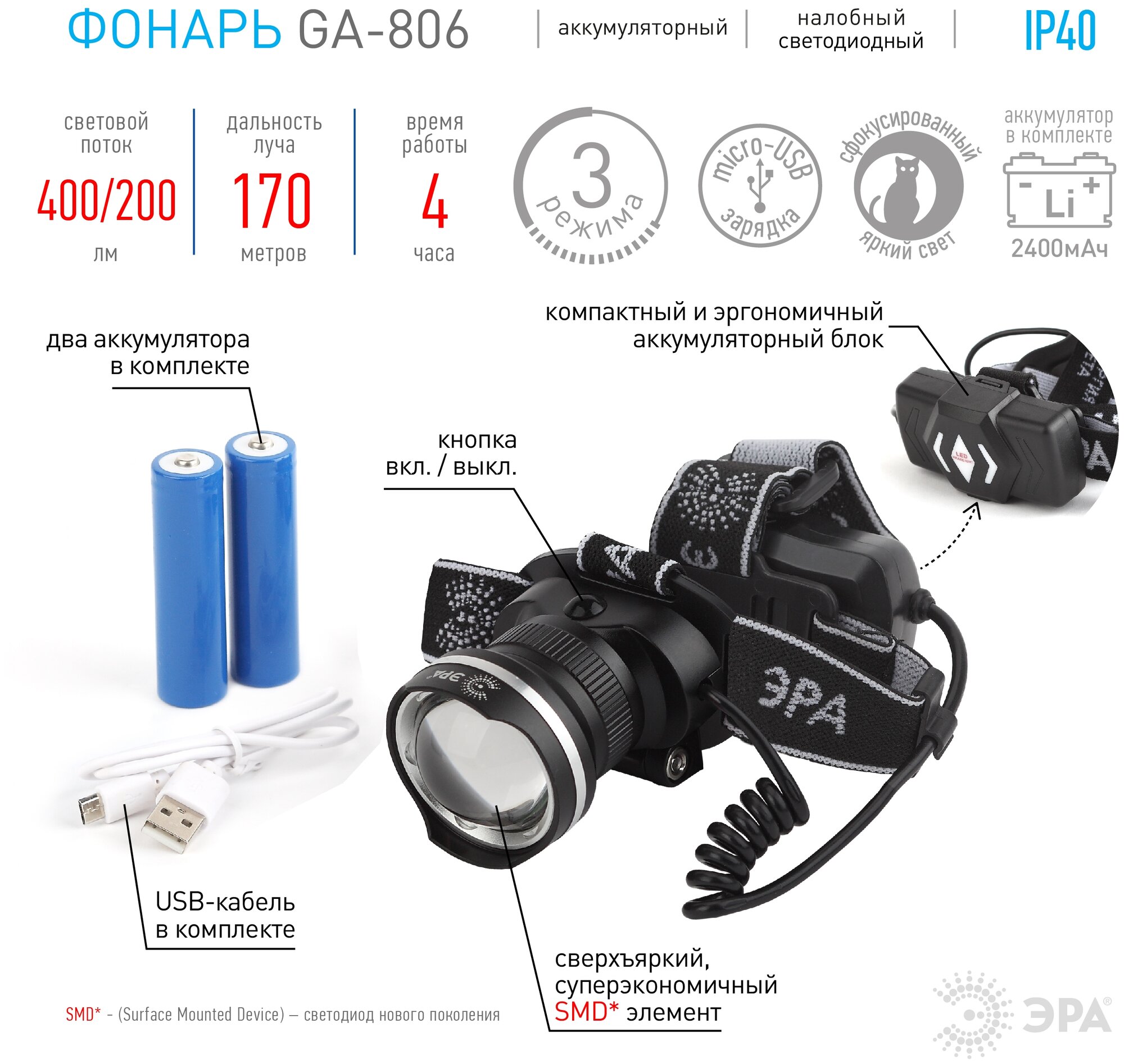 Фонарик Фонарь GA-806 ЭРА налобный аккумуляторный, рег фокус, [5 Вт CREE, алюминий, литий 2,5Ач, USB, короб