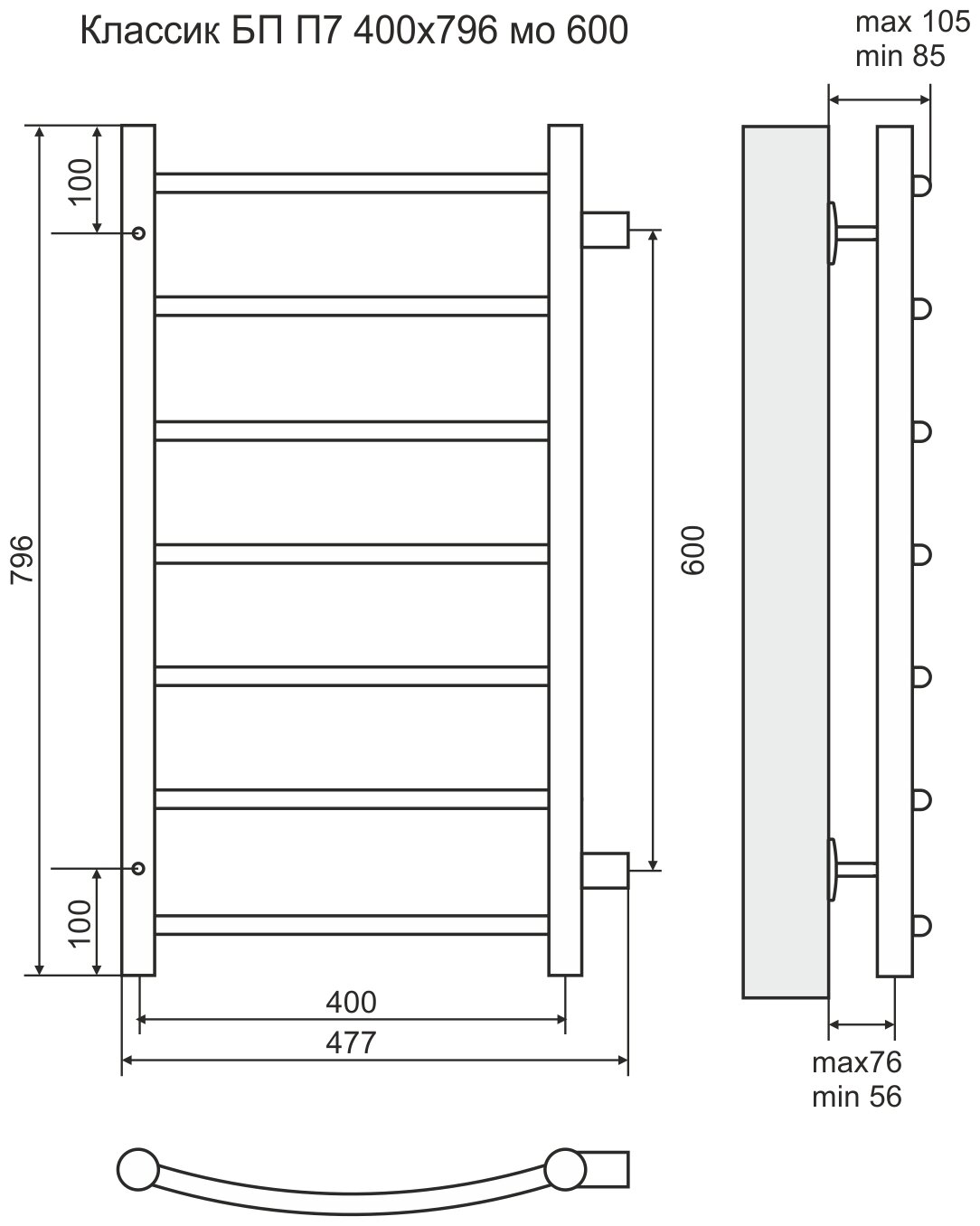 Полотенцесушитель Полотенцесушитель Классик с бок подкл 32/20 П7 м/о 600, 400мм*796мм, Terminus (Россия), арт КлассБП7-400796