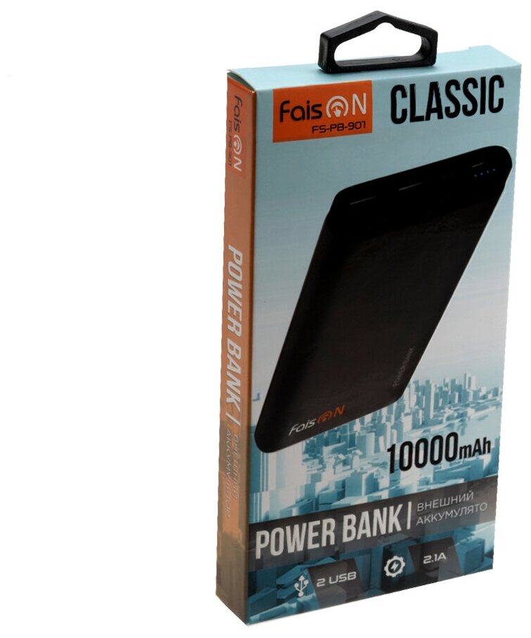 Powerbank Портативный аккумулятор FaisON FS-PB-901, Classic, 10000mAh, металл, 2 USB выхода, индикатор, 2.1A, цвет: чёрный