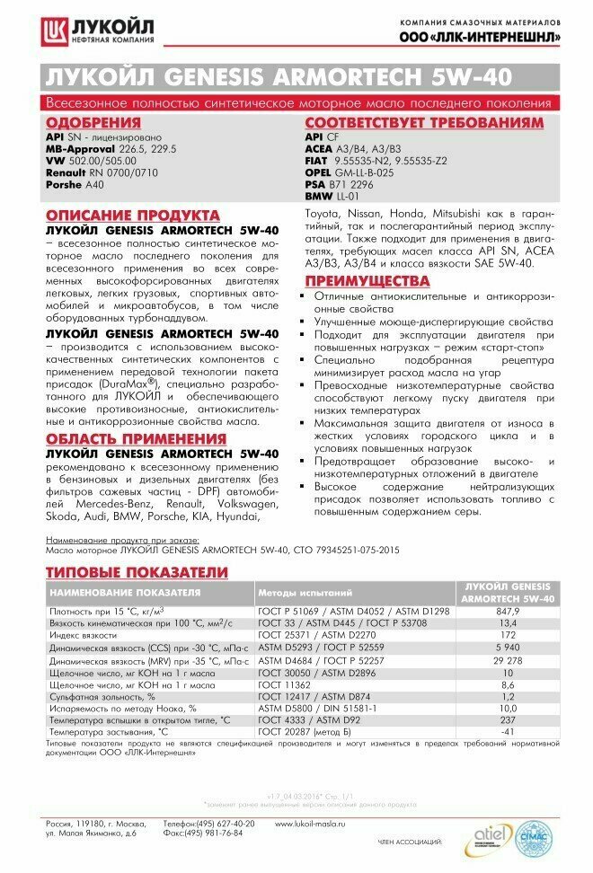 Лучшие цены. ЛУКОЙЛ GENESIS ARMORTECH 5W-40 - всесезонное полностью синтетическое моторное масло последнего поколения для применения во всех современных высокофорсированных двигателях легковых, легких грузовых, спортивных автомобилей и микроавтобусов, в том числе оборудованных турбонаддувом. Подходит для автомобилей марок: AUDI, BMW, CHERY, CITROEN, GEELY, GREAT WALL, HYUNDAI, KIA, LEXUS, LIFAN, MERCEDES-BENZ, MINI, MITSUBISHI, NISSAN, PEUGEOT, PORSCHE, RENAULT, SEAT, SKODA, SSANGYONG, SUBARU, SUZUKI, TOYOTA, VOLKSWAGEN. Магазины в вашем городе.
