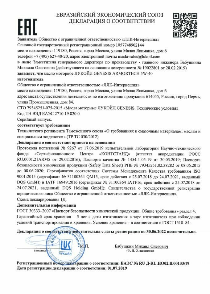 LUKOIL GENESIS ARMORTECH 5W-40 Артикул: 3148675