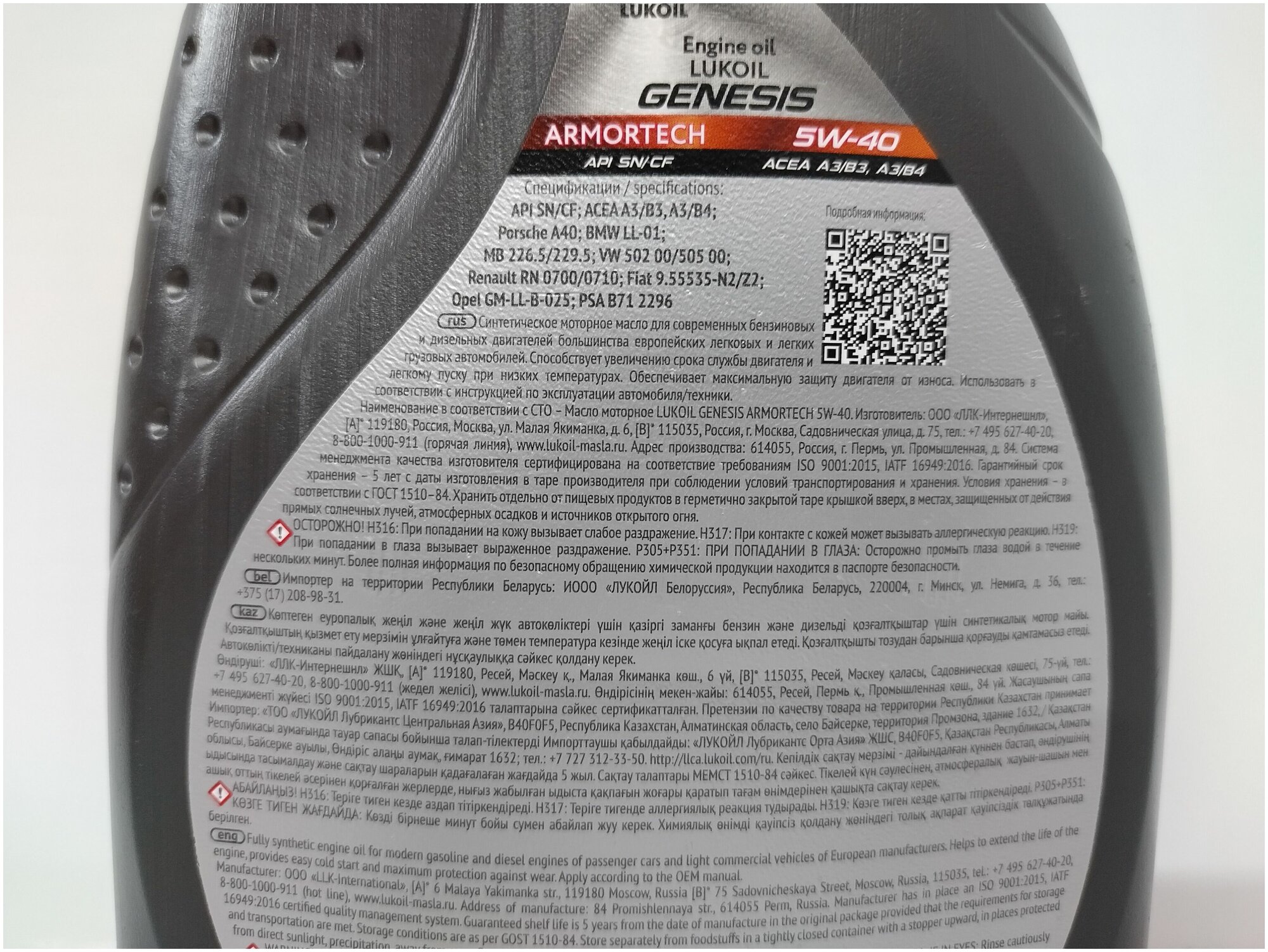 Лучшие цены. Одобрено: API SN - лицензировано MB-Approval 226.5, 229.5 VW 502.00/505.00 Renault RN 0700/0710 Porsche A40 BMW LL-01 Соответствует требованиям: API CF ACEA A3/B4, A3/B3 FIAT 9.55535-N2, 9.55535-Z2 OPEL GM-LL-B-025 PSA B71 2296 ЛУКОЙЛ GENESIS ARMORTECH 5W-40 - всесезонное полностью синтетическое моторное масло последнего поколения для применения во всех современных высокофорсированных двигателях легковых, легких грузовых, спортивных автомобилей и микроавтобусов, в том числе оборудованных турбонаддувом. Магазины в вашем городе.