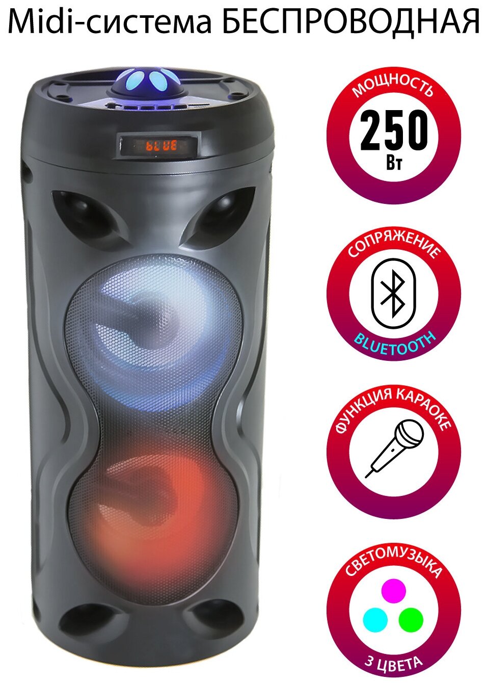 Миди-система беспроводная SUPRA SMB-330 с Bluetooth, караоке, поддержкой А2DP, FM-тюнером и подсветкой, 250 Вт