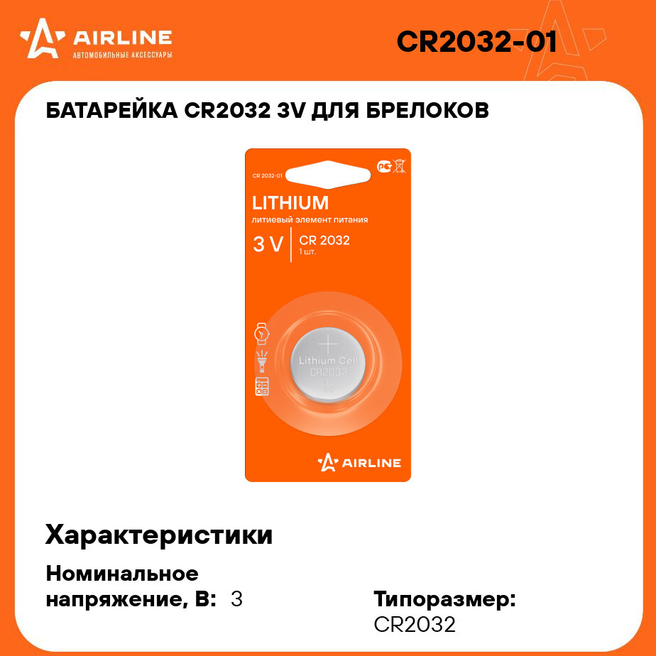 CR203201 AIRLINE Батарейка CR2032 3V для брелоков сигнализаций литиевая 1 шт. (CR2032-01)