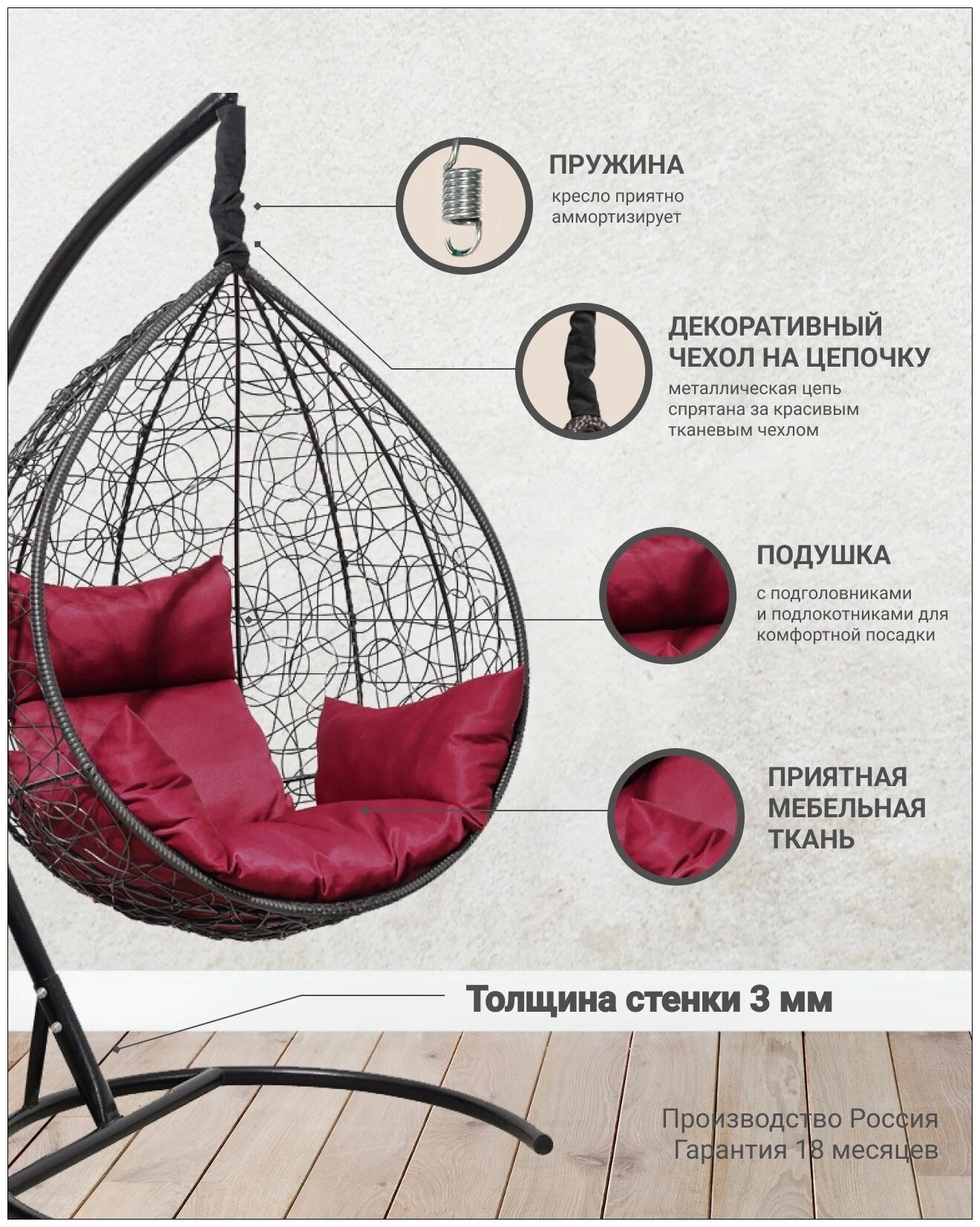 Садовая качель Подвесное кресло-кокон SEVILLA черный + Стойка для подвесных кресел черная LAURA ( подушка бордовая.Материал - полиэстор)