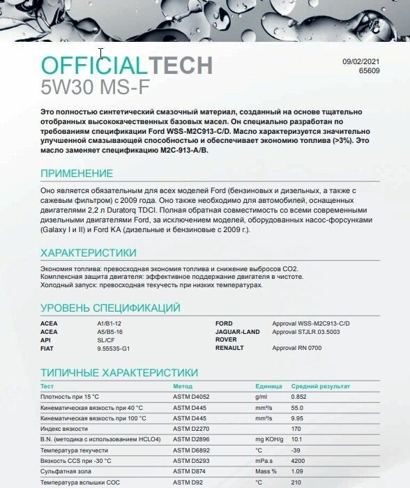 Лучшие цены. Описание Это полностью синтетический смазочный материал, созданный на основе тщательно отобранных высококачественных базовых масел. Он специально разработан по требованиям спецификации Ford WSS-M2C913-C/D. Масло характеризуется значительно улучшенной смазывающей способностью и обеспечивает экономию топлива (>3%). Это масло заменяет спецификацию M2C-913-A/B. применения Оно является обязательным для всех моделей Ford с 2009 года. Оно также требуется для автомобилей с двигателями 2,2 Duratorq TDCI. Магазины в вашем городе.
