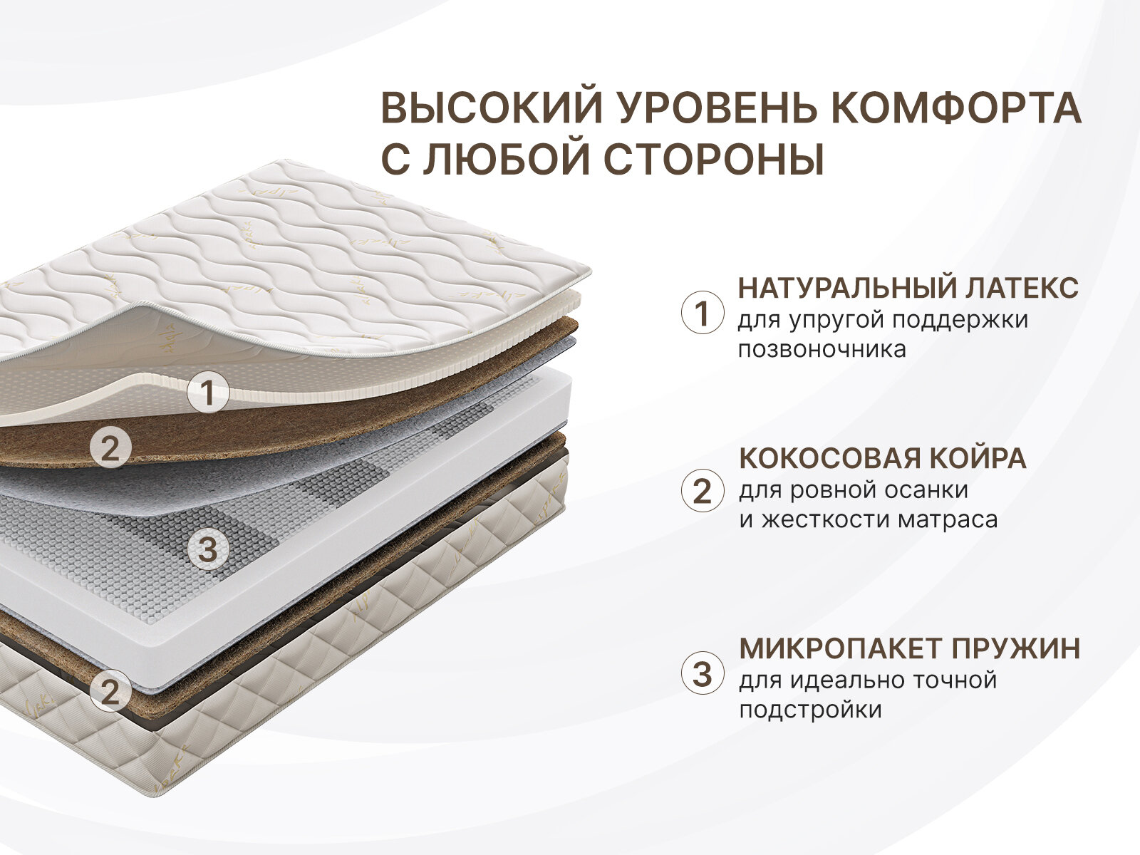 Лучшие цены. Матрас Микро Медиум Хард подходит для большинства людей, так как он имеет две разные по жесткости стороны: выше среднего и жёсткую. Вы можете легко изменить уровень комфорта, перевернув матрас. Одна сторона матраса выполнена из комбинации природного латекса и кокосовой койры, а другая - только из койры. Оба наполнителя являются натуральными и обладают хорошей воздухопроницаемостью, а также не накапливают пыль и влагу, что обеспечивает комфорт при использовании матраса. Магазины в вашем городе.