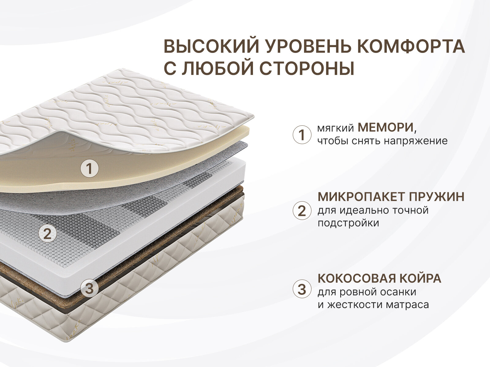 Лучшие цены. Матрас с эффектом памяти Микро Мемо Хард имеет две стороны с разной жесткостью: жёсткую и мягкую. Сторона с пеной Мемори идеально подходит для тех, кто ценит максимальный комфорт во время сна. Инновационная пена с эффектом памяти обладает свойством “запоминания” формы тела и обеспечивает удобоне и уютное спальное место. Сторона с кокосовой койрой больше подойдет для любителей ровных и жестких поверхностей. Магазины в вашем городе.