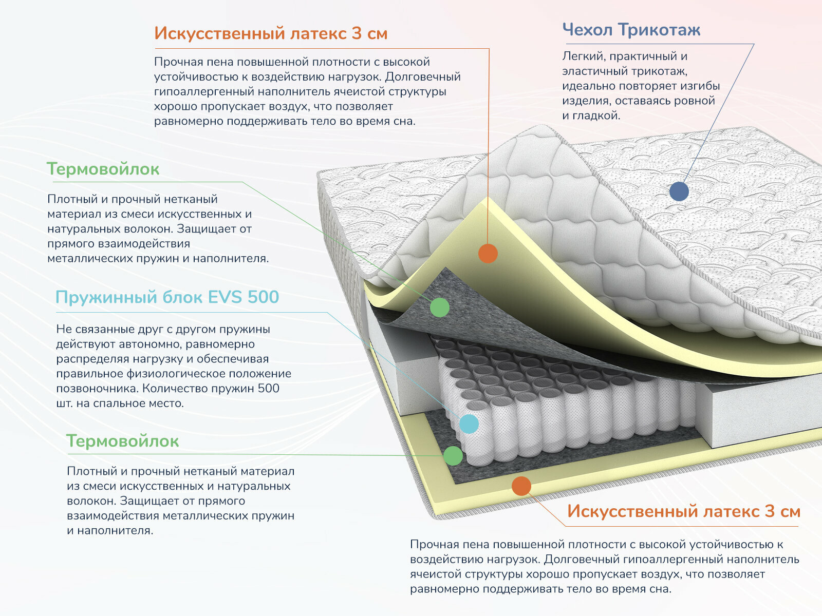 Лучшие цены. Среднежёсткий анатомический матрас ОК Базис Плюс – это недорогая и практичная модель. Изделие оснащено независимым пружинным блоком EVS500 и комфортным наполнителем искусственный латекс. Наполнители: Другое название материала – Микс Фоам. Это пена, полученная из пенополиуретана, со специальной пропиткой. По своим свойствам искусственный латекс очень похож на натуральный, единственное отличие – он немного жёстче своего природного собрата. Магазины в вашем городе.