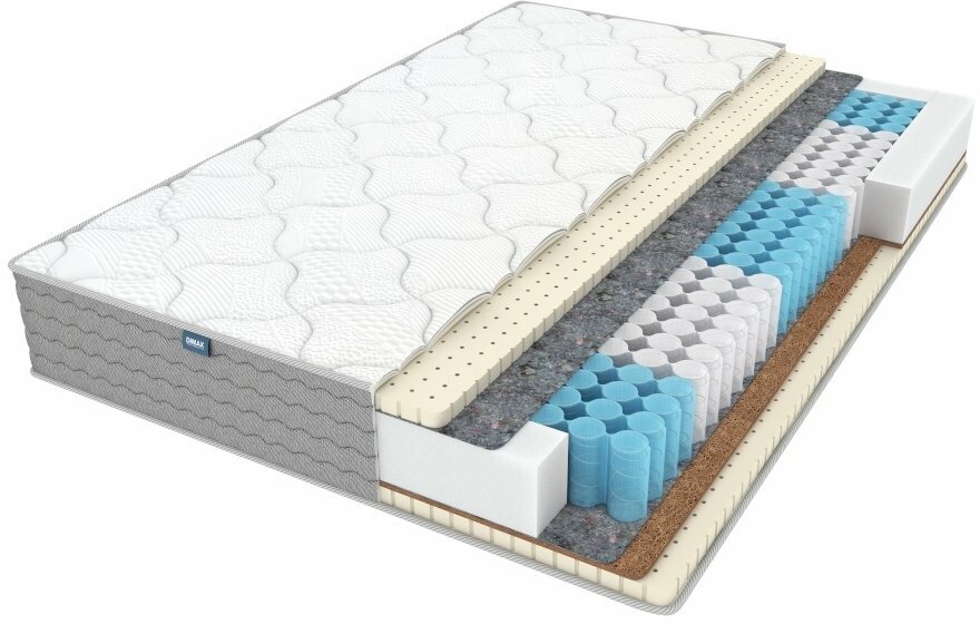 Лучшие цены. Пружины матраса ОК Медиум Софт расположились с частотой 250 штук на метр кв., что обеспечивает ортопедичность и устойчивость к нагрузкам. Блок работает автономно, бесшумно и не продавливается со временем. Натуральные наполнители из койры кокоса и перфорированного латекса расположены по обе стороны матраса образуя разную жесткость. С одной стороны от пружин проложен слой мягкого латекса, со второй, сочетание койры и латекса. Латекс смягчает койру и придает поверхности анатомичности и комфорта. Магазины в вашем городе.