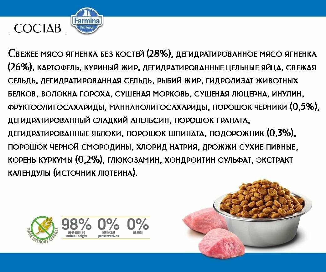 | Ингредиенты | мясо ягненка 40%, дегидрированная баранина 30%, рис |