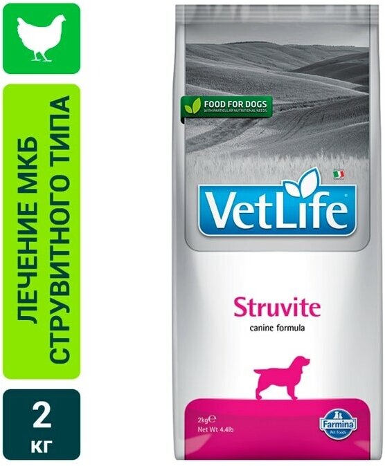 Лучшие цены. Vet Life Dog Struvite Растворение и подавление образования струвитных уролитов. Подкисление мочи. Farmina Vet Life Struvite – диетический сухой корм для собак при мочекаменной болезни для подавления образования и растворения струвитных уролитов. Контроль pH мочи. Контроль pH мочи осуществляется благодаря добавке сульфата кальция и обеспечивает условия для растворения кристаллов. Сниженное содержание магния. Сниженное содержание магния ограничивает образование струвитов. Сниженное содержание белка. Магазины в вашем городе.