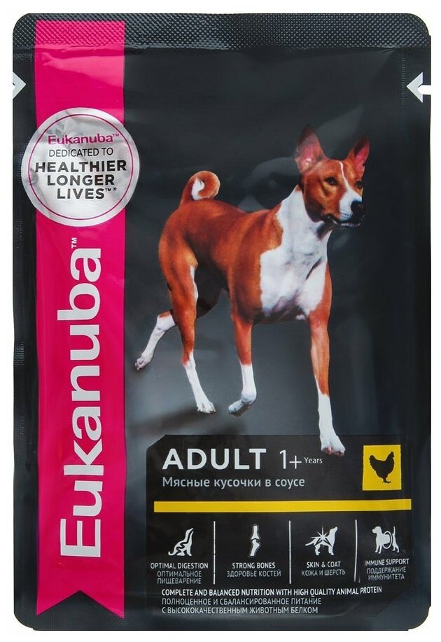 Лучшие цены. Eukanuba Dog Паучи для взрослых собак из курицы в соусе Влажный рацион из курицы в соусе для взрослых собак. Полноценное и сбалансированное питание с высококачественным животным белком для взрослых собак всех пород Ежедневное сочетание влажных и сухих рационов залог здоровья вашей собаки. Это доказано клиническими исследованиями мирового лидера в области диетологии и ветеринарии Waltha™. Магазины в вашем городе.