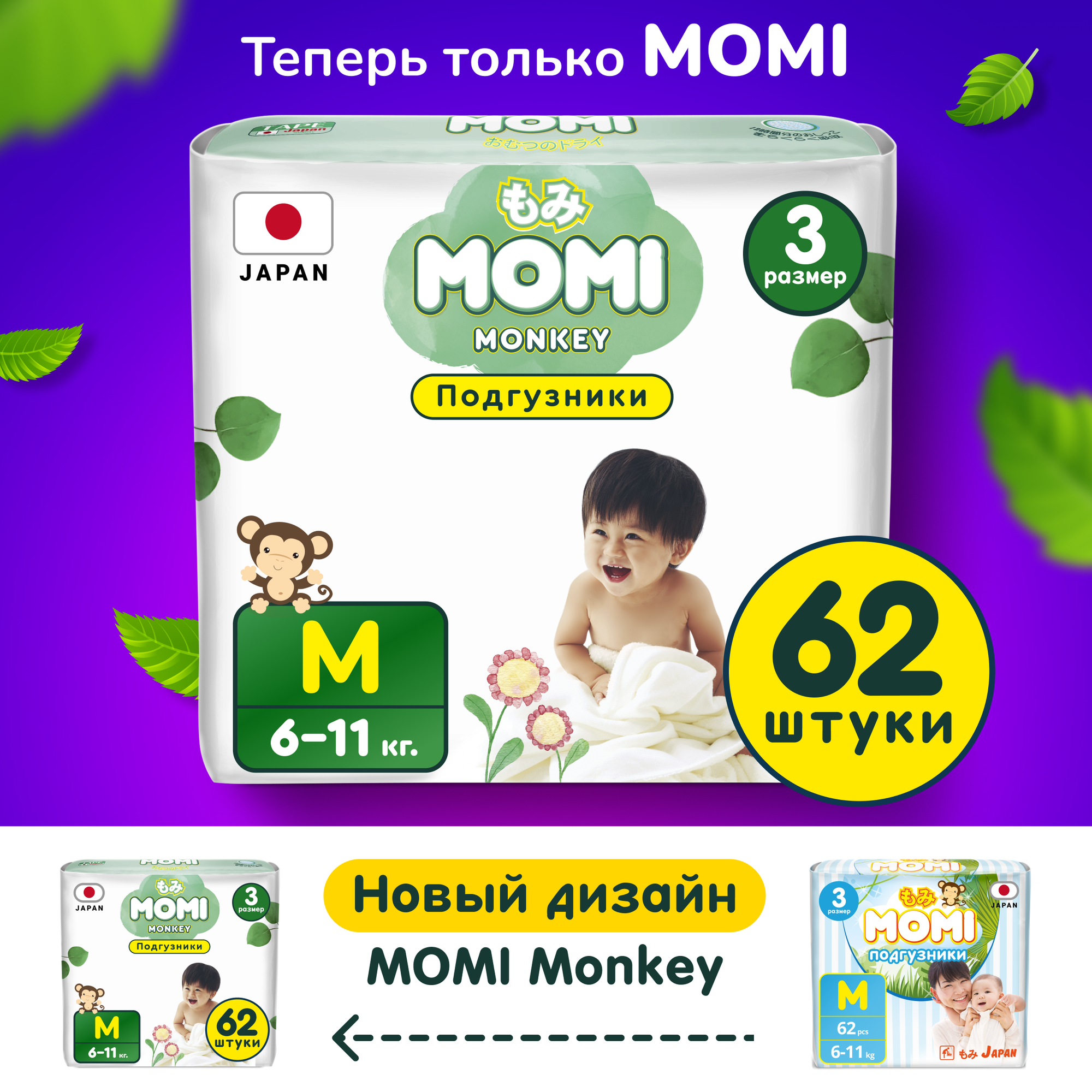 Momi MONKEY японские подгузники детские 6-11 кг размер 3 M, 62 шт