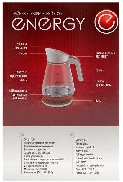 Лучшие цены. Артикул: 1036-138. Материал: Металл, пластик, стекло, Объем: 1500 мл., Вес: 1220 гр., Размер упаковки: 18 x 27 x 22 см., Температурное ограничение: Нет, Тип нагревательного элемента: Закрытый, Регулировка температуры: Нет, Подсветка: Да, Цвет: Белый, Материал корпуса: Стекло, Поддержание температуры: Нет, Мощность, Вт: 2200, Индикатор уровня воды: Да, Гарантийный срок, мес.: 12, Двойные стенки: Нет. Магазины в вашем городе.