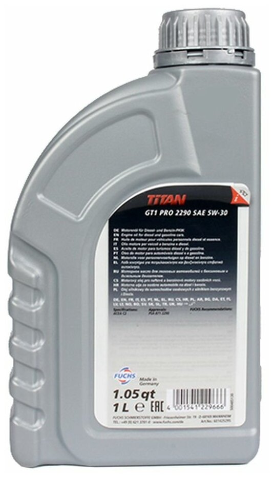 Лучшие цены. FUCHS Titan GT1 PRO 2290 5W-30 - инновационное моторное масло премиум-класса для современных легковых автомобилей. Подходит для современных двигателей автомобилей с оптимизированным расходом топлива. В долгосрочной перспективе масло будет обеспечивать чистоту турбокомпрессора для поддержания оптимизированного давления наддува. Отлично защищает сажевые фильтры, системы CRT и окислительные катализаторы. Также значительно улучшена экономия топлива по сравнению с другими обычными моторными маслами. Магазины в вашем городе.