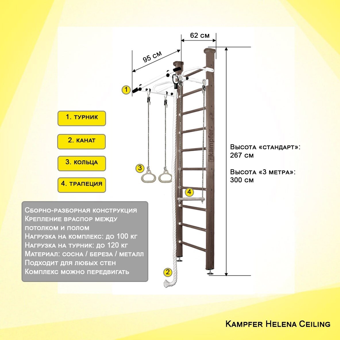 Лучшие цены. Детский спортивный комплекс Kampfer Helena Ceiling Basketball Shield - создан из экологически чистого дерева. Предназначит для спортивных занятий детей, подростков и их родителей. ДСК имеет распорное крепление, что позволяет без труда установить его в любом месте комнаты, а при необходимости, демонтировать и переставить. Максимально допустимая нагрузка на шведскую стенку 120 кг, а на турник 100 кг, поэтому ДСК смогут использовать все члены семьи.Классическая модель Helena Ceiling с баскетбольным щитом. Магазины в вашем городе.
