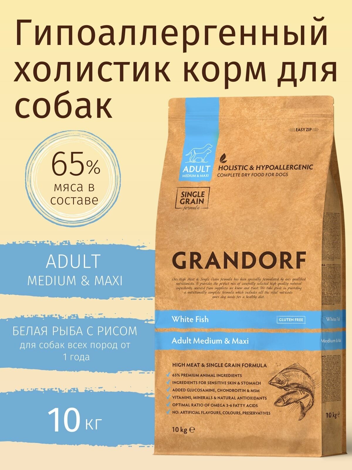 GRANDORF DOG Сухой корм для собак средних и крупных пород, белая рыба, 10кг