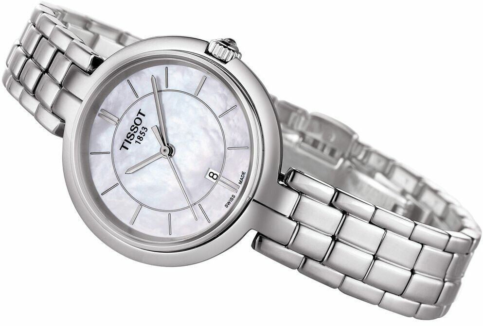 Швейцарские кварцевые часы Tissot Flamingo T094.210.11.111.00 на стальном браслете, с водозащитой 5 бар и международной гарантией от производителя