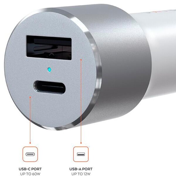 Автомобильное зарядное устройство Satechi 72W Type-C PD Car Charger. Входное напряжение 12В. Порты 1 x USB-A 12W, 1 x USB-C 60W. Цвет серебряный.