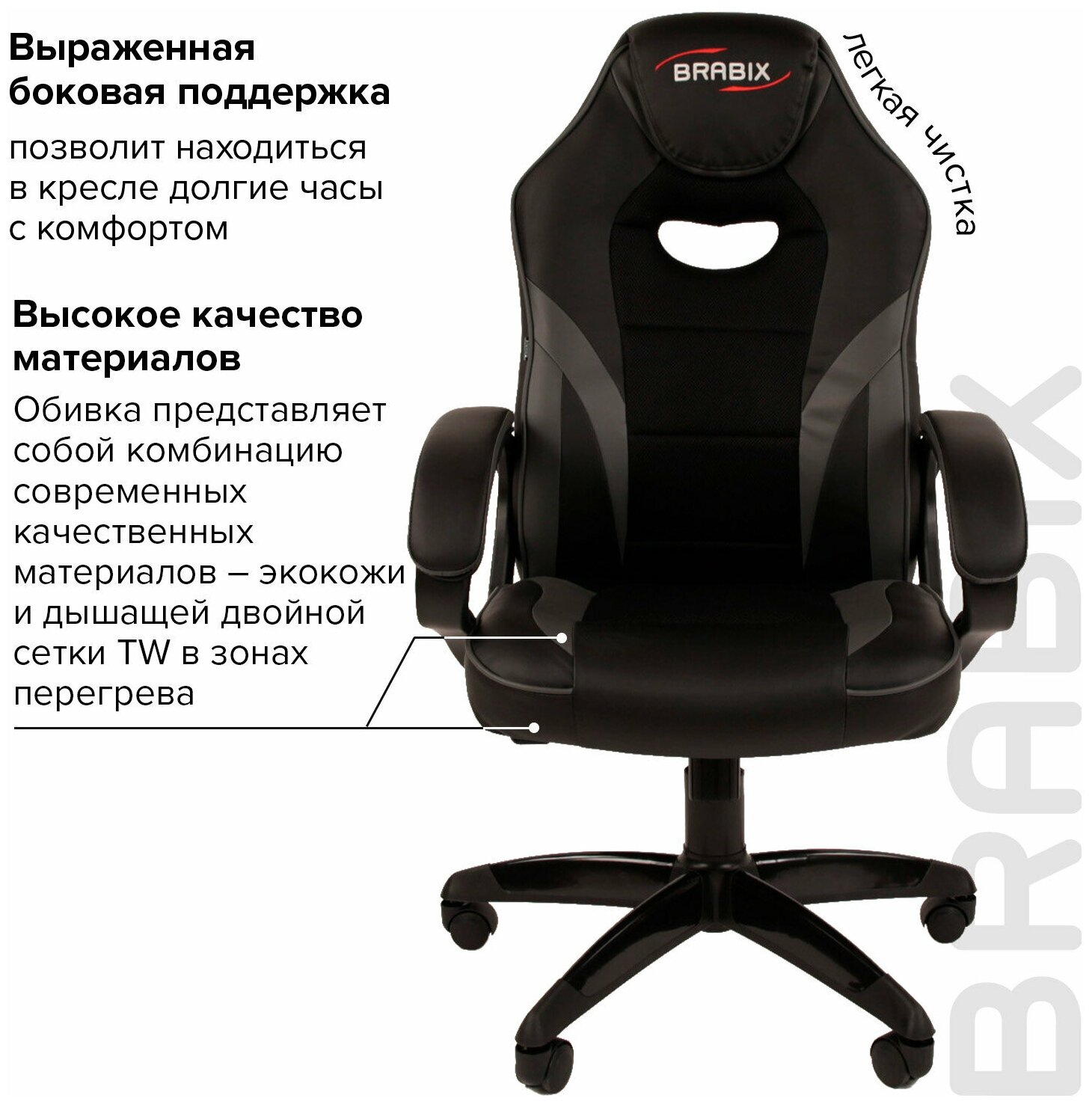 Кресло геймерское Brabix "Accent GM-161", ткань TW/экокожа, черное/серое, 532576, 7083504