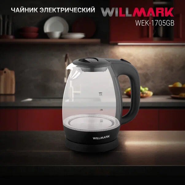 Чайник электрический WILLMARK WEK-1705GB (1.7л, пов. на 360 град., LED-подсв., корп. из стекла, черный, 2200Вт)